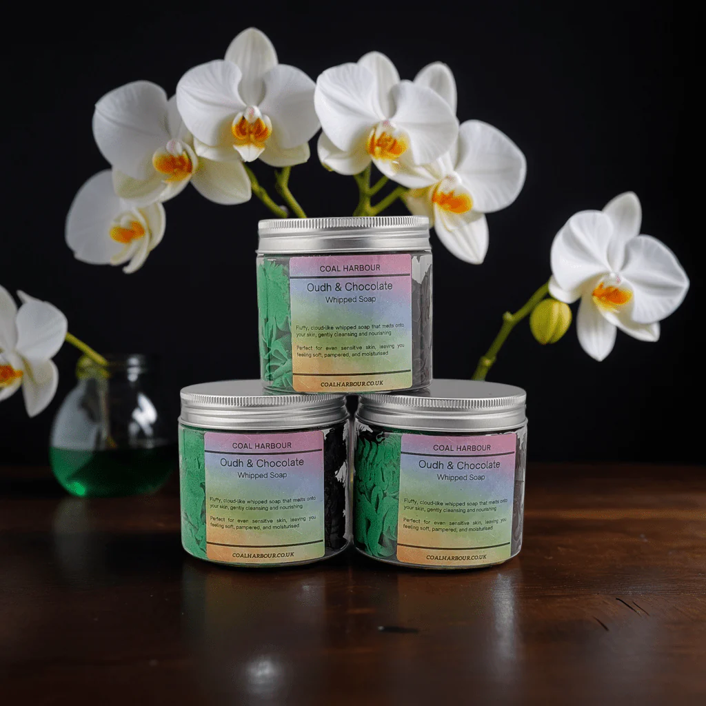 Oudh and Chocolate Whipped Soap: Decadent blend of velvety chocolate and deep oudh – warm, sweet, and aromatic
